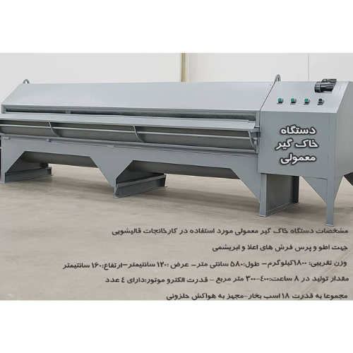 دستگاه خک گیر فرش تکروصنعت برای جداسازی و جمعآوری گرد و غبار موجود در فرشها طراحی شده است مخصوصاً زمانیکه آلودگیها پس از شستشو نیز باقی میمانند تا آمادهسازی فرش برای مرحلهی بعدی شستشو انجام شود